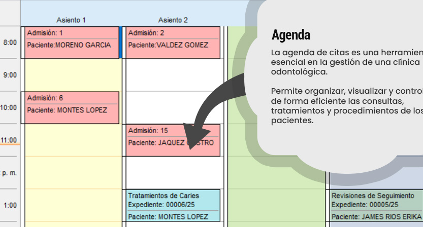 El sistema permite registrar y organizar citas en distintos asientos o unidades dentales, facilitando el trabajo simultáneo de varios odontólogos o especialistas dentro de la misma clínica.